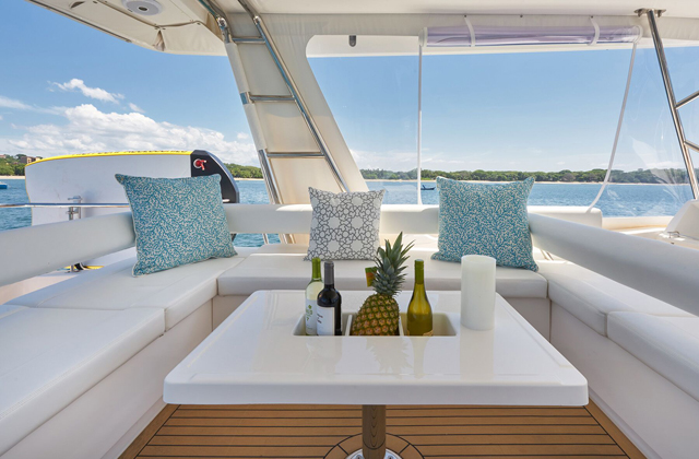 The PG open saloon area has a seating are in a wide U-shape that has enough room for eight guests. This area is filled with natural light and provides the clients with amazing views of the Pacific Ocean and enjoy watching coastline where you will spot hidden coves, white sand beaches and remote little bays. The aft door can slide open completely and a door to the front of the boat allows easy circulation and great natural ventilation for those hot Guanacaste Dry Season days.