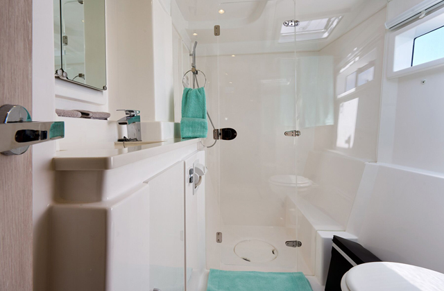 - There is one master cabin in the starboard hull with a spacious place equipped with a queen-size bed. A private ensuite head is located right outside of the master cabin in the forward part of the hull, featuring a separate shower for secluded privacy.