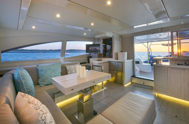 - The front of the main deck, which is also accessible from the saloon, includes another shaded sitting area with tables great for relaxing and seating more people.